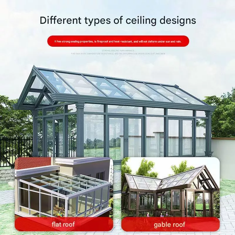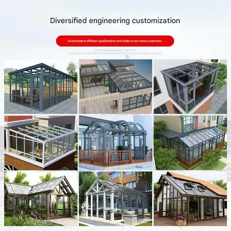 Glacann an seomra gréine a fráma alúmanaim briseadh teirmeach + struchtúr gloine tempered inslithe. Tá an fráma comhdhéanta de cholúin, bíomaí, agus tacaíochtaí trasnánach, le chéile trí chóras modúlach a Tacaíonn stíleanna díon il, lena n-áirítear díonta beannacha, díonta cothroma, agus díonta cuartha .